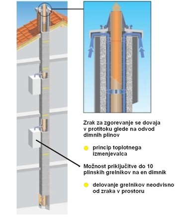 posameznih plinskih grelnikov po jašku med dimno cevjo in zunanjim betonskim plaščem. Plinski grelniki tako delujejo neodvisno od zraka v prostoru. Dimni plini se iz dimnika odvajajo z nadtlakom.